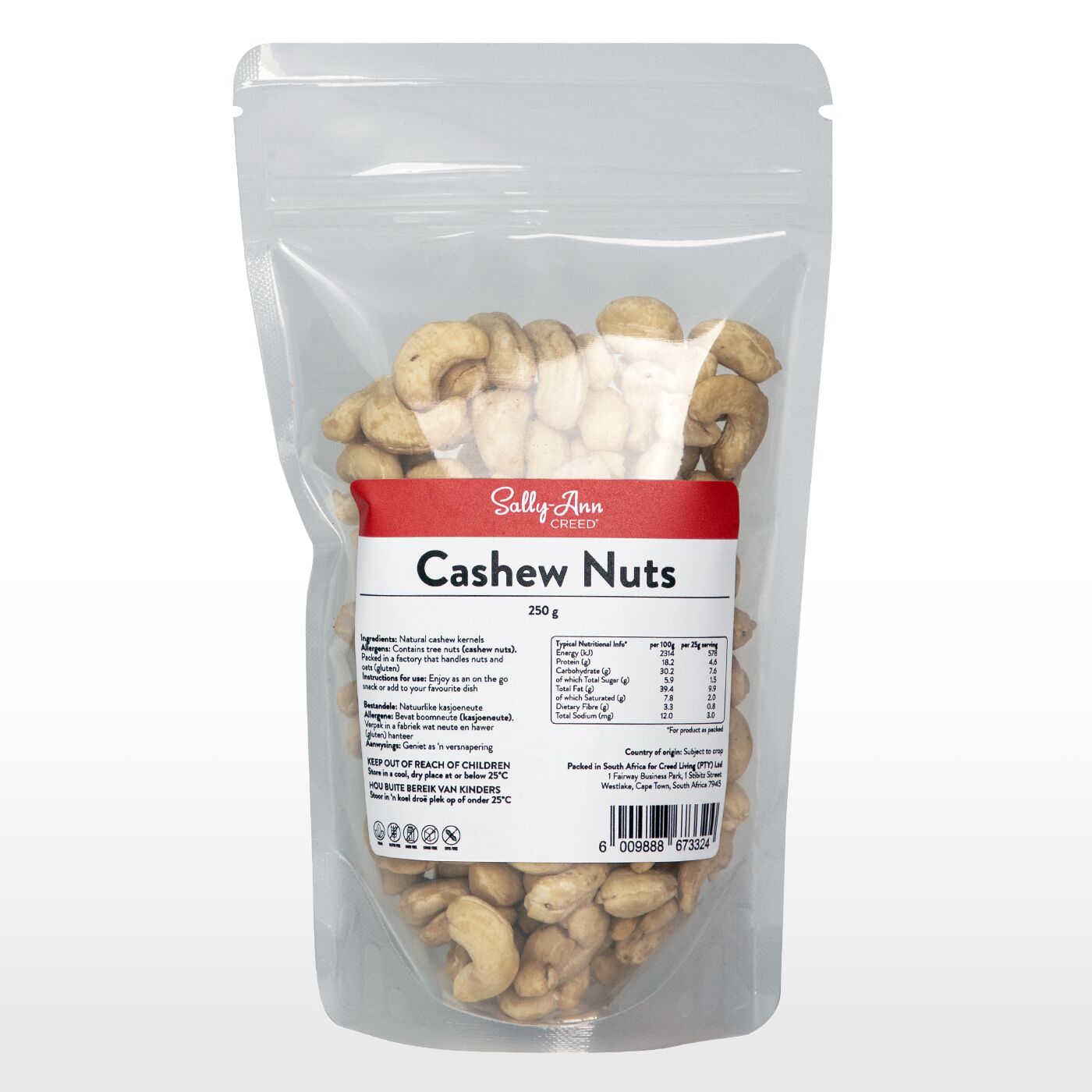 Allergens: Contains tree nuts (cashews). Packed in a factory that handles nuts and oats (gluten)