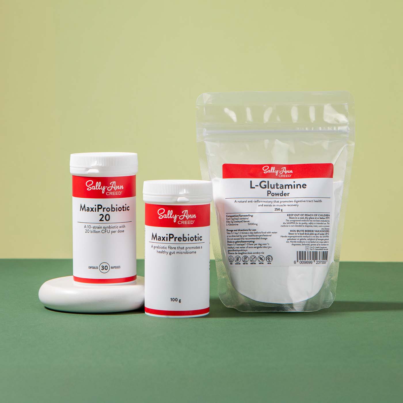 This is a true ‘Synbiotic’. A synbiotic combines prebiotic fibre and probiotics into one powerhouse supplement. Our Sally-Ann Creed® MaxiBiotic is a 10-strain probiotic bacteria and yeast per dose that delivers 20 billion colony-forming units (CFUs) per vegicap.