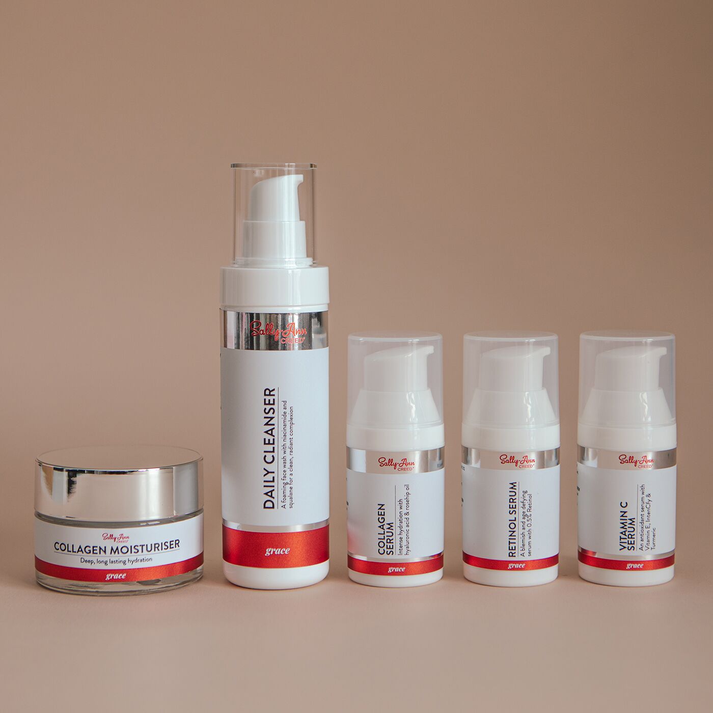 Ingredients: For the full ingredients list, click the following links, Daily Cleanser, Mosturiser, Collagen Serum, Vitamin C Serum, Retinol Serum
